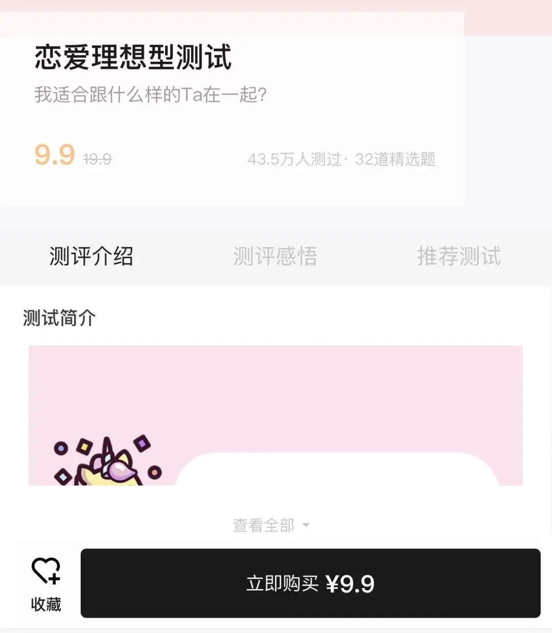 测试商城中,除了用来引流的“今日限免”板块,其余测试都要收费,价格从5.9元到29.9元不等。其中,恋爱理想型测试人数最多,有43.5万人为此送钱,9.9元一份。