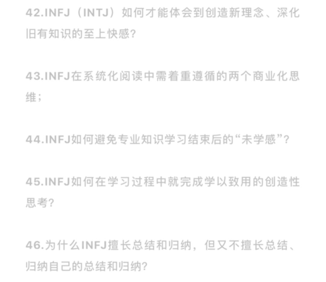 譬如“为什么INFJ擅长总结和归纳,但又不擅长总结、归纳自己的总结和归纳?”,这样富含哲理和语病的陈述,大概会让INFJ感到灵魂共振并想要迅速下单。
