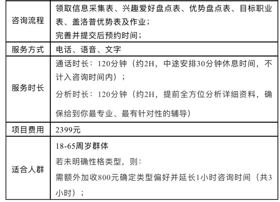 比如某公众号上卖的付费咨询服务,2399元包120分钟电话咨询,适用于已经明确自己性格类型的人,咨询师会给出推荐的职业生涯定位,包括行业和岗位的转型策略,升职加薪指南;若是没有明确性格类型,那么咨询师还要另收800元咨询费,总计3199元。