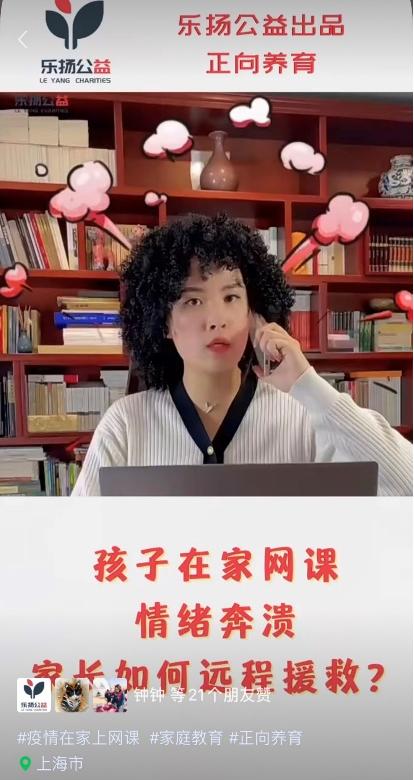“网课期间孩子在家如何管理时间?”“孩子不愿睡觉怎么办?”"孩子在家无聊,家长不能陪伴怎么办?"乐扬公益工作人员介绍,“我们上线的家庭教育视频,根据未成年人及家长的生活学习节奏安排,内容循序渐进,也很贴合需求。”