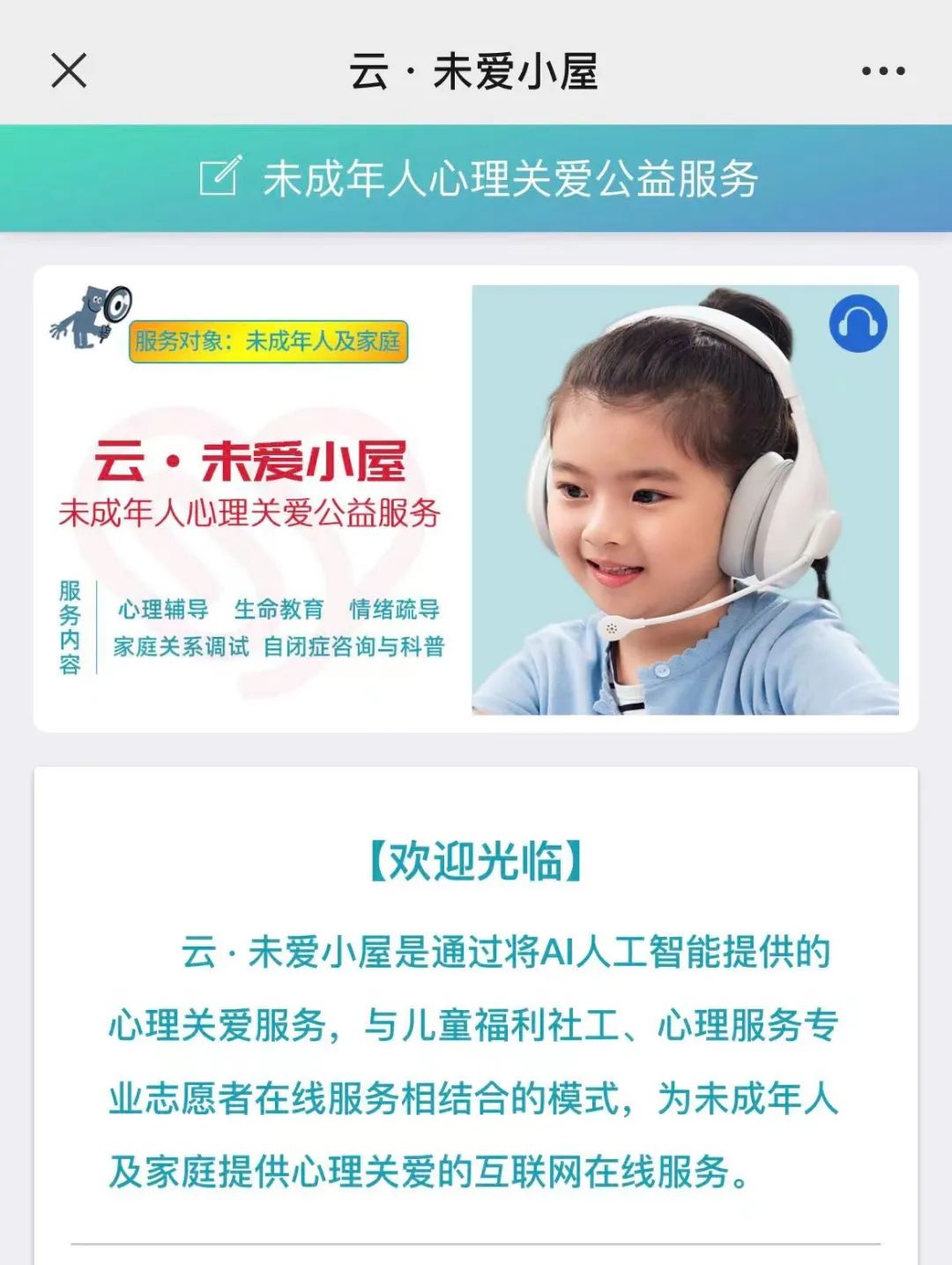 为助力抗疫,“未爱小屋”根据未成年人居家网课遇到心理关爱问题,由乐扬公益积极整合高端技术资源,依托数字化技术,上线“云·未爱小屋”——心理关爱服务线上服务平台,通过AI人工智能与在线儿童福利社工、心理关爱专业志愿者组成专业服务队伍相结合,共同为未成年人及家庭提供便捷、精准的心理关爱公益服务。