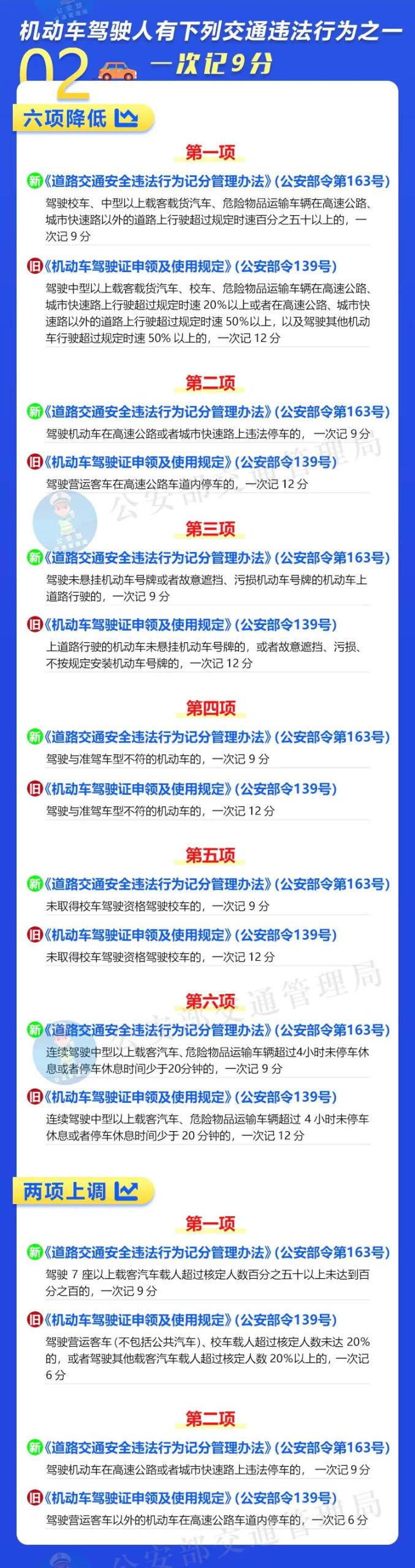 三是减少一次记满12分的记分行为。调整后一次记12分的记分行为由11项减少为7项,新增一次记9分的记分行为7项,一次记6分的记分行为由14项减少为11项,一次记3分的记分行为由12项增加为15项,一次记1分的记分行为由4项增加为10项。