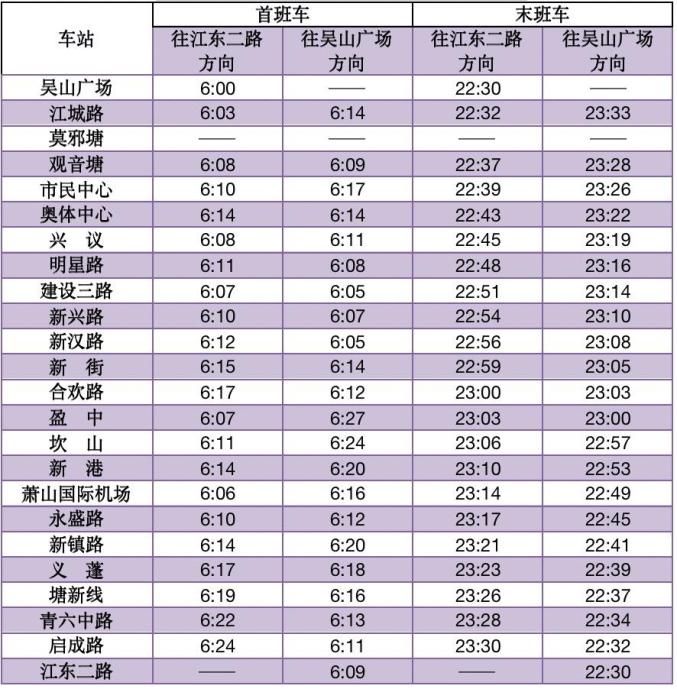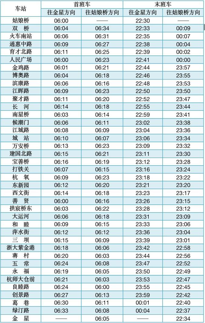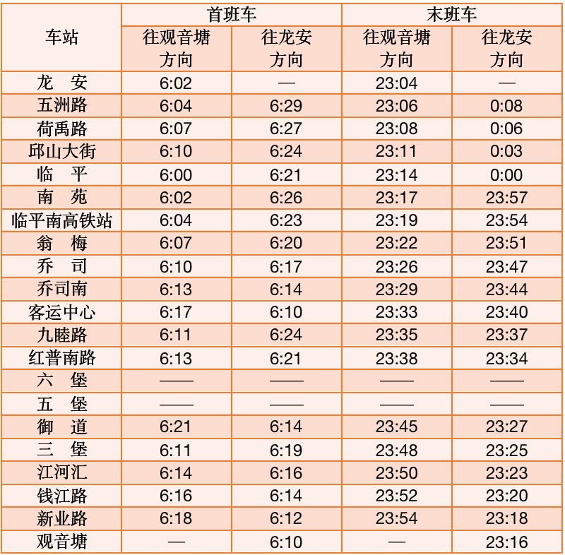 此次通车的南段工程全长约12公里,设10座车站,分别为观音塘站、新业路站、钱江路站、江河汇站、三堡站、御道站、五堡站、六堡站、红普南路站、九睦路站,其中五堡站、六堡站暂缓开通。