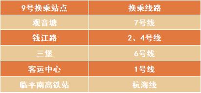 9号线乘客可在客运中心站换乘1号线;三堡站换乘6号线;钱江路站换乘2、4号线;观音塘站换乘7号线;临平高铁站换乘杭海线。