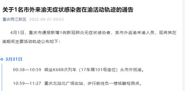 4月1日,重庆市通报新增1例新冠肺炎无症状感染者,系市外返渝来渝人员,现将其在渝期间主要活动轨迹公布如下: