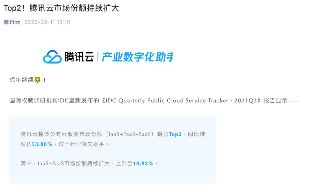 但稍早前的2月份,腾讯云也在其官方微信公众号中,强调自身Top 2的市场地位,不过口径则是IaaS+PaaS+SaaS整体的市场份额。