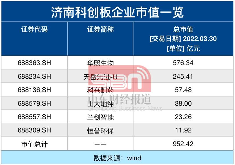 Wind系统显示,截至3月30日收盘,上述6家济南科创板企业总市值达952.42亿元。其中,华熙生物以576.34亿元市值位居济南科创板企业榜首,也是目前山东19家科创板企业中市值最高者。