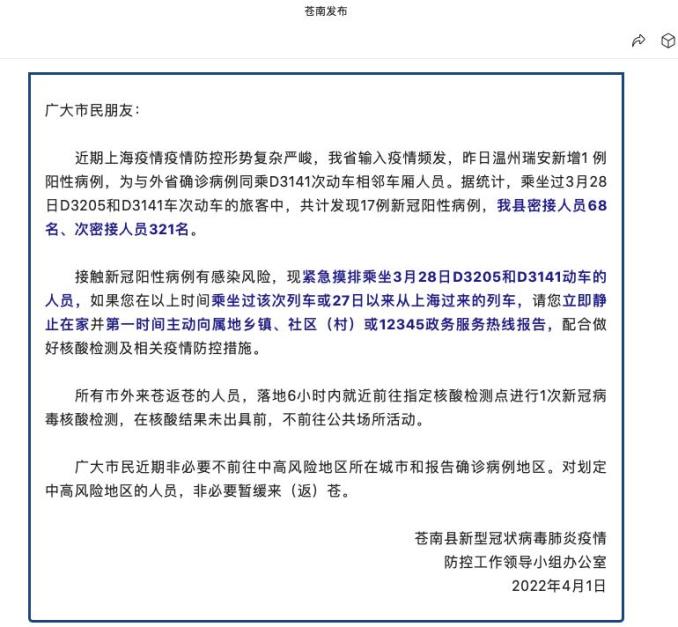 另据浙江温州市苍南县新冠肺炎疫情防控工作领导小组办公室4月1日通报,据统计,乘坐过3月28日D3205和D3141车次动车的旅客中,共计发现17例阳性病例,该县密接人员68名、次密接人员321名。