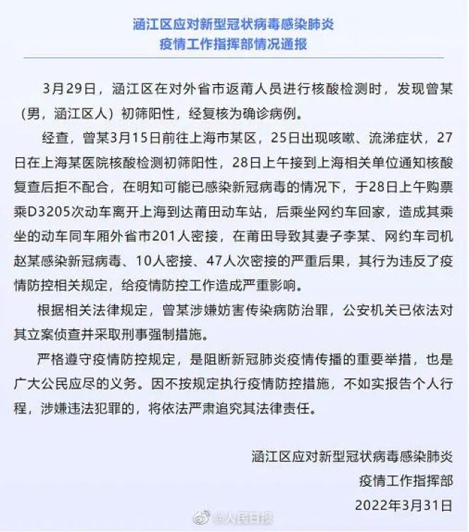 3月28日D3205次动车的关联疫情,则与一名逃避检查的初筛阳性患者曾某有关。其在明知自己核酸检测阳性情况下,逃避检查乘坐动车返回福建莆田,致使同车厢201人密接。目前,已有多地报告同车感染者。