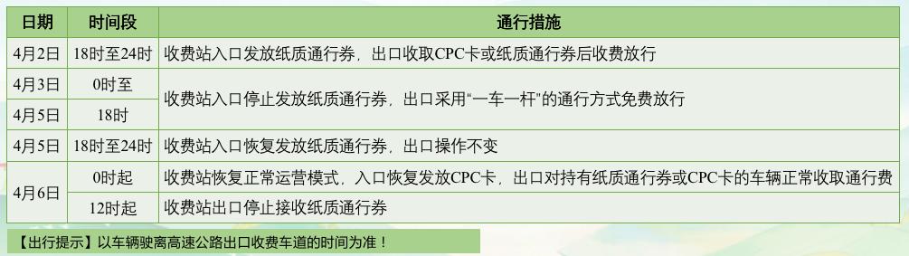 清明期间,全省高速公路实施7座(含)以下小型客车免费通行!免费时间为:4月3日0时~4月5日24时。对于MTC小型客车具体通行措施如下: