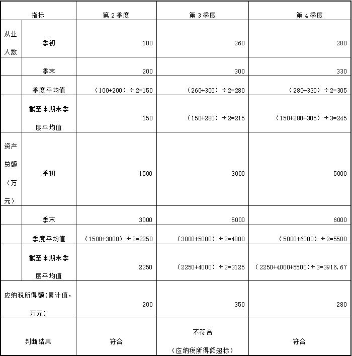 例1.A企业2020年成立,从事国家非限制和禁止行业,2022年各季度的资产总额、从业人数以及累计应纳税所得额情况如下表所示: