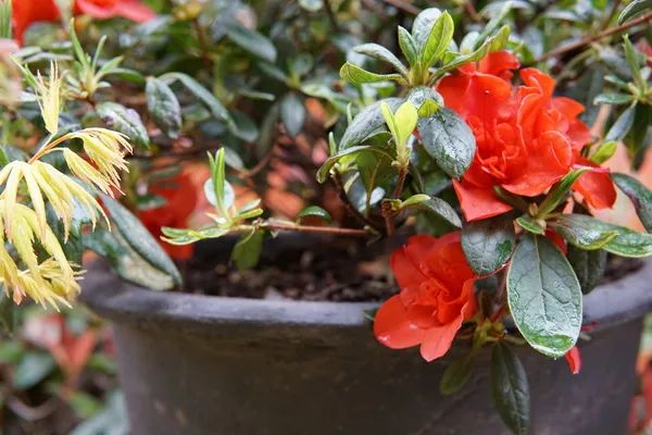 杜鹃和茶花一样也是喜酸植物。一棵安酷杜鹃“余烬”,一年能开八个月以上,开到视觉疲劳。为它换了一只黑色光滑的泥盆,和泛橙的火色最配。“余烬”冬天也一直开个不停,只是颜色旧了,像个疲惫的美人。旧花还未谢,歇都没歇,开春就一边长叶一边继续冒花苞。