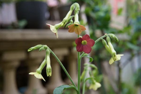极少种一年、二年生植物。花园太小,播种不便,自播的条件也不好,它们是奢侈。今年种了几棵适合半荫环境的两年生植物毛地黄,一棵一年生的花烟草。没想到花烟草那么早就开花了。花背黄绿,花面铁锈红,一枝独秀。