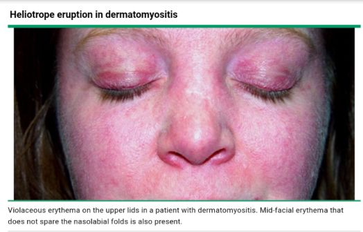 面中度红斑(皮肌炎):累及鼻唇沟,可见上眼睑红色至紫罗兰色的皮疹。在日光暴露后加重。