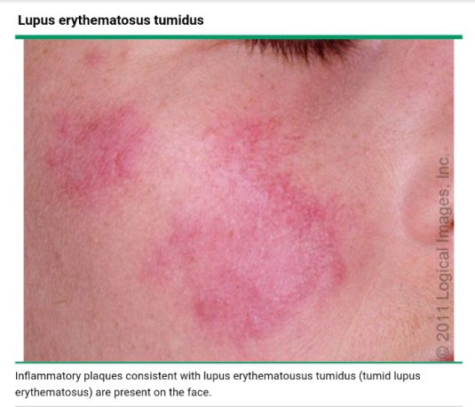 肿胀性红斑狼疮表现为日光暴露区域出现红色斑块,如面部、颈部、上躯干及上肢,通常无鳞屑,在日光暴露后加重。绝大多数患者不伴全身性狼疮,活检有助于诊断。