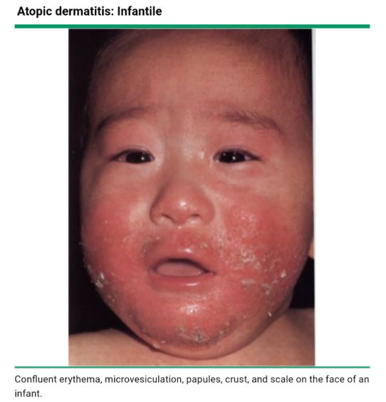 婴幼儿(0-2岁)中,特应性皮炎发生在伸侧面和脸颊或头皮,通常不累及尿布区。典型表现为瘙痒、发红、鳞屑,可包括水疱,严重者可出现浆液性渗出和结痂。常有明显的瘙痒。
