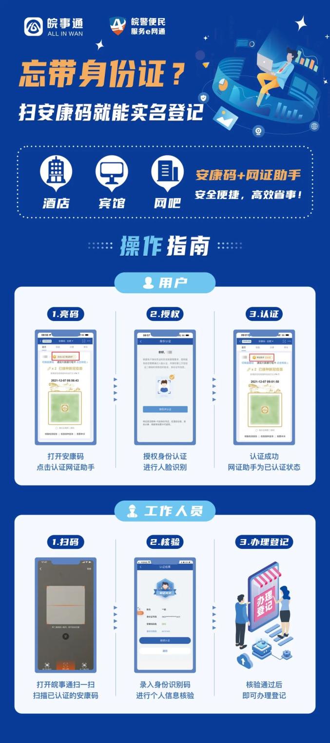 安徽省数据资源管理局联合安徽省公安厅打通安康码与“网证助手”系统,方便未携带身份证的群众通过扫安康码办理登记。