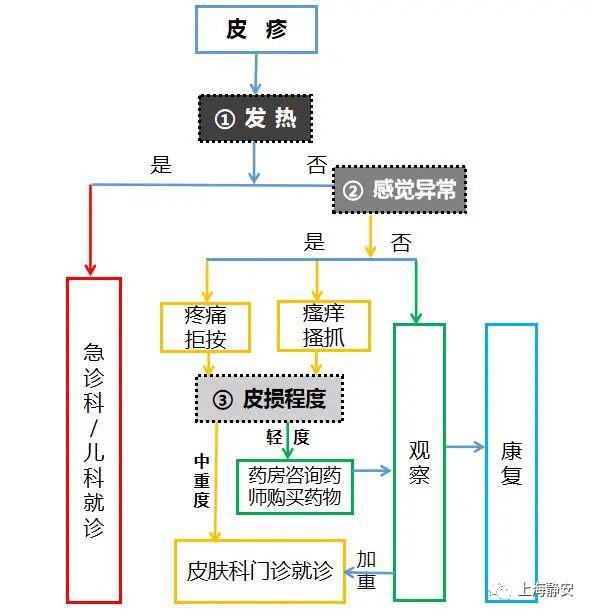如果确定没有发热,不妨观察下宝宝的情绪和日常表现。孩子没有发热哭闹,情绪稳定,表现如常,皮疹也没有明显变化的情况下,可以暂时观察,等疫情平复再去医院皮肤科就诊咨询。如果孩子出现局部皮疹后有一些异常表现,有反复搔抓遇热烦躁不安的,大多数是过敏反应引起的皮肤瘙痒;疼痛拒触碰,哭闹加重的,可能是皮肤感染引起的炎症性疾病。如有以上症状,如何处理呢?先别急这就要看最后一步。