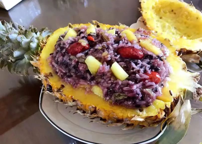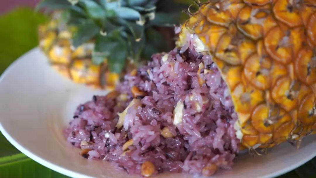菠萝饭► 一道独具特色的云南傣族美食,是一道特别的甜点。用菠萝作容器,蒸出来的香糯米和紫米混合着菠萝丁,酸甜滑软,有米饭的香糯,又有水果的酸甜,清甜可口。