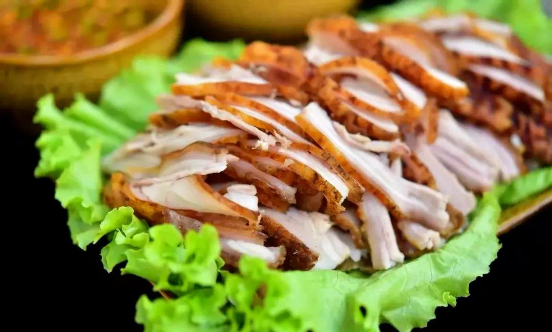 火烧猪是德宏各少数民族待客的一道大菜,要选用当地特产的小耳朵猪,皮薄肉质鲜嫩,去除内脏后塞入香茅草、香嫣叶、缅桃叶、野香菜等烤制而成。虽然火烧猪在许多地方都有,但在德宏能算得上一道特色美食,因为有独特的火烧技法和用腌菜膏、鱼腥菜、芫荽、小米辣等做的蘸水搭配。把火烧猪连皮带肉切成薄片,往醮水里一滚,口感酥脆,肉质松软,芳香四溢,让其在火烧猪系列中脱颖而出。