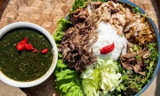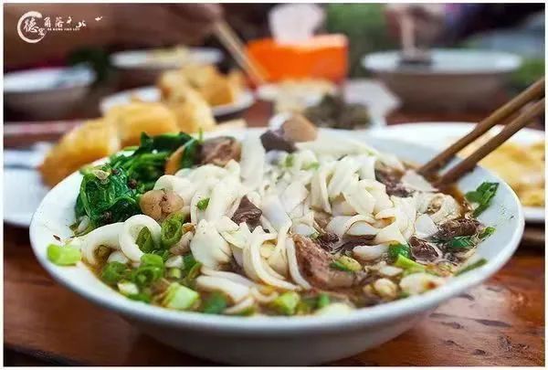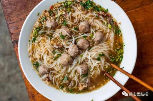 过手米线是阿昌族的传统美食,也是德宏地区的招牌小吃之一。吃时因需先取一团米线置于手心,然后将拌料放在米线上食用,由此而得名"过手米线"。红红的米线搭配上鲜肉剁碎成的馅料、烤肉、烤牛舌、凉菜、干萝卜猪骨头汤等配菜,味道绝美。倘若有蚂蚁蛋、蜂蛹等食材制成的拌料,那味道则更是鲜美了。