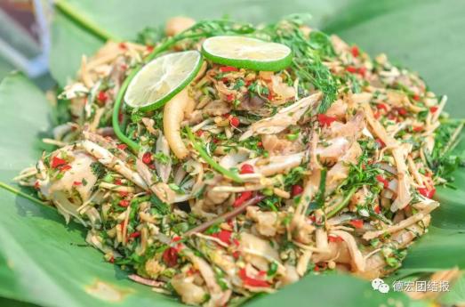 鬼鸡,曾是景颇族历史上用鸡做祭祀的祭品,后来慢慢演变成一道特色美食。鸡煮熟晾凉撕碎,再佐以剁碎的姜、蒜、缅芫荽、柠檬叶等相关配料,配入盐、味精、酱油等调料制成。在过去,只有山官(景颇族的头人)、贵族才能享用这道菜。为了能常常吃到这道美味,聪明的景颇族人将“鬼鸡”端上了饭桌,并作为款待客人的上好佳肴。