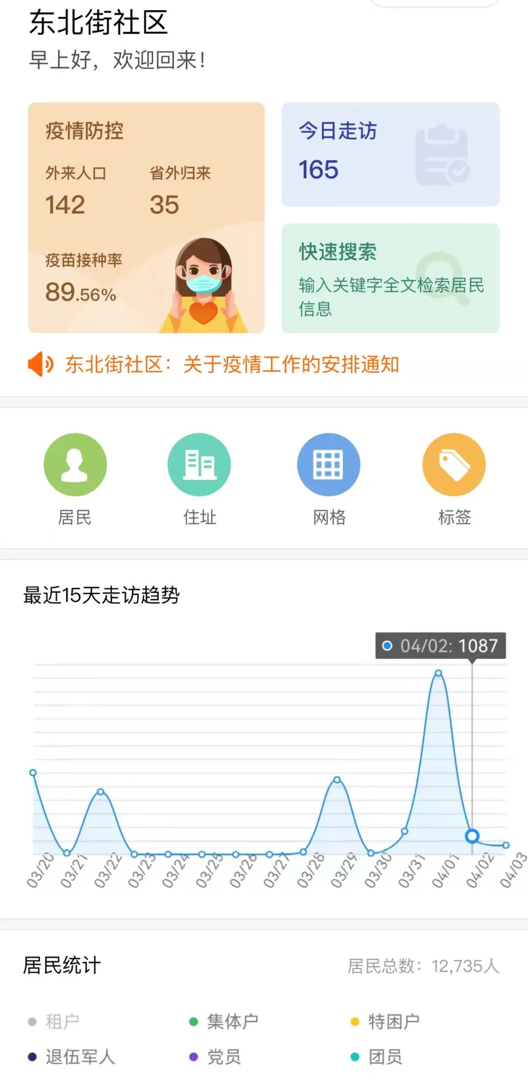 在基层工作中,小程序往往发挥着大作用。去年9月份,福州点墨科技有限公司为连江的社区工作人员量身定制的一款“凤城走透透”微信小程序,用科技赋能社区信息化管理。此次疫情期间,该小程序在保障数据安全且自主可控基础上,通过完善居民信息管理、走访管理、标签管理等功能,最大程度地帮助社区工作人员减轻工作负担,并依托凤城智慧社区综合服务平台,“大数据”实时更新汇总社区居民的人员信息,有效避免人工错误、时间延误,助力当地疫情防控精准化、智能化,为社区工作人员打造高效便捷的工作环境。