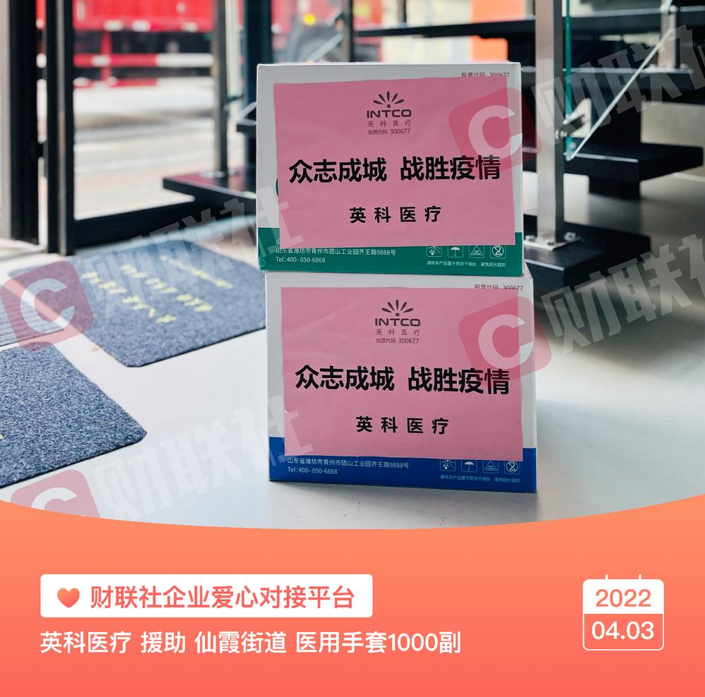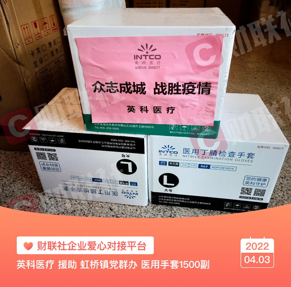 4月3日下午,英科医疗通过财联社“同心守沪”企业爱心对接平台捐赠5000副医用手套。这批手套目前已送到虹桥镇、仙霞路街道、长寿路街道等六个街镇的一线防疫工作人员,助力核酸筛查顺利开展。