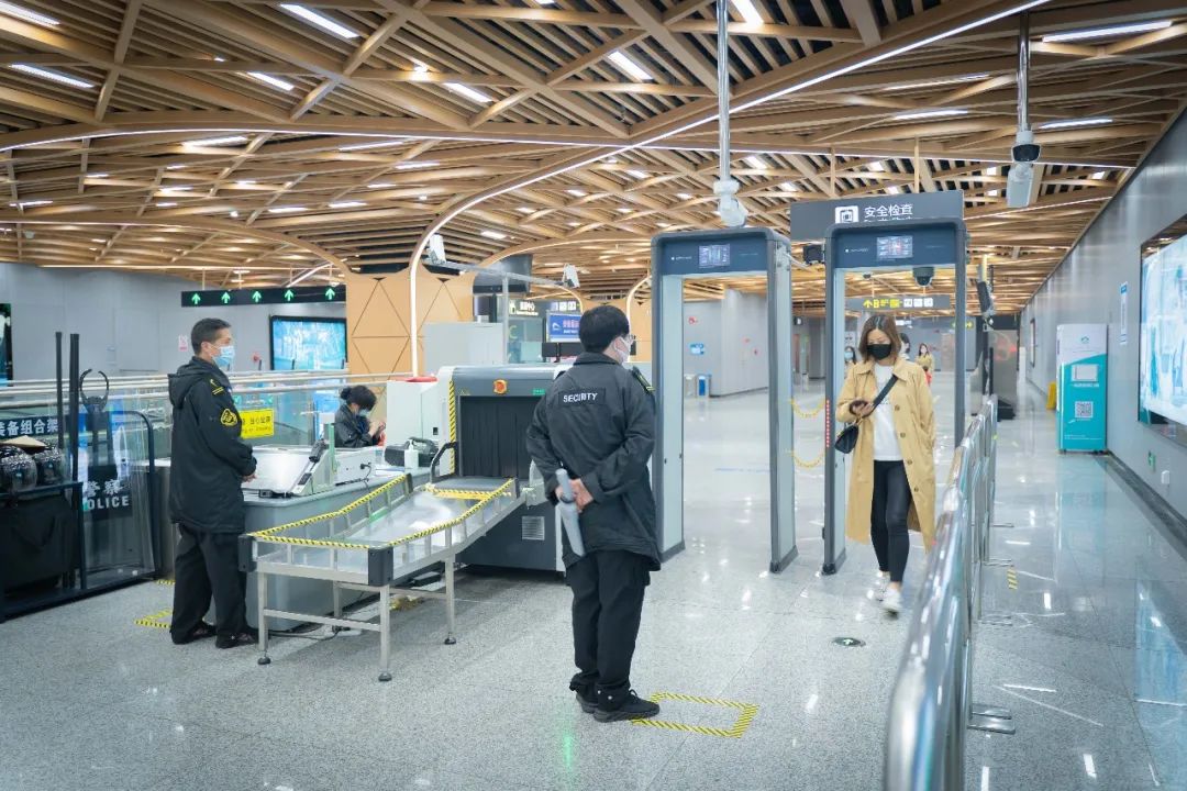 车站票亭、安检点均配备有免洗洗手液,部分站点试点推出了免接触移动消毒站,为乘客提供智慧化安全化的出行服务。