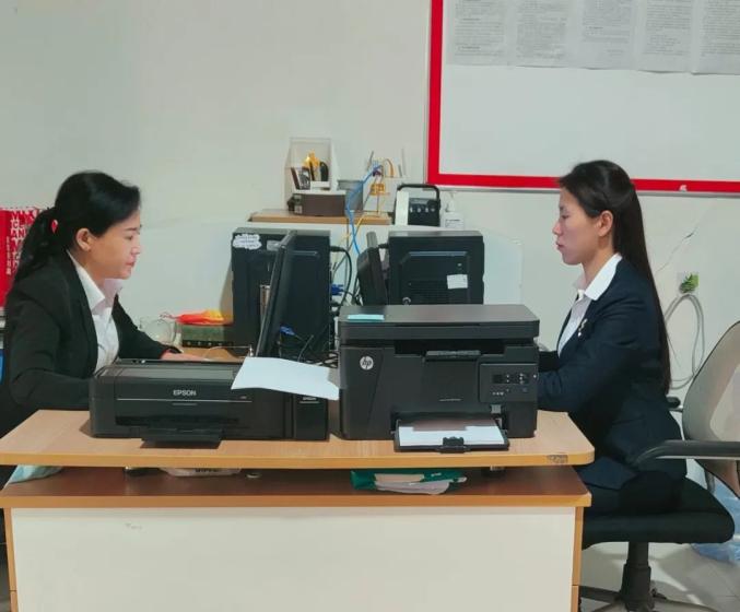 冯丽颖(左)和刘伟鹏参加就业培训后,在卓越留校工作。