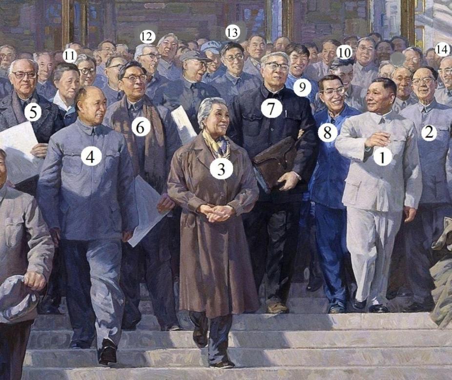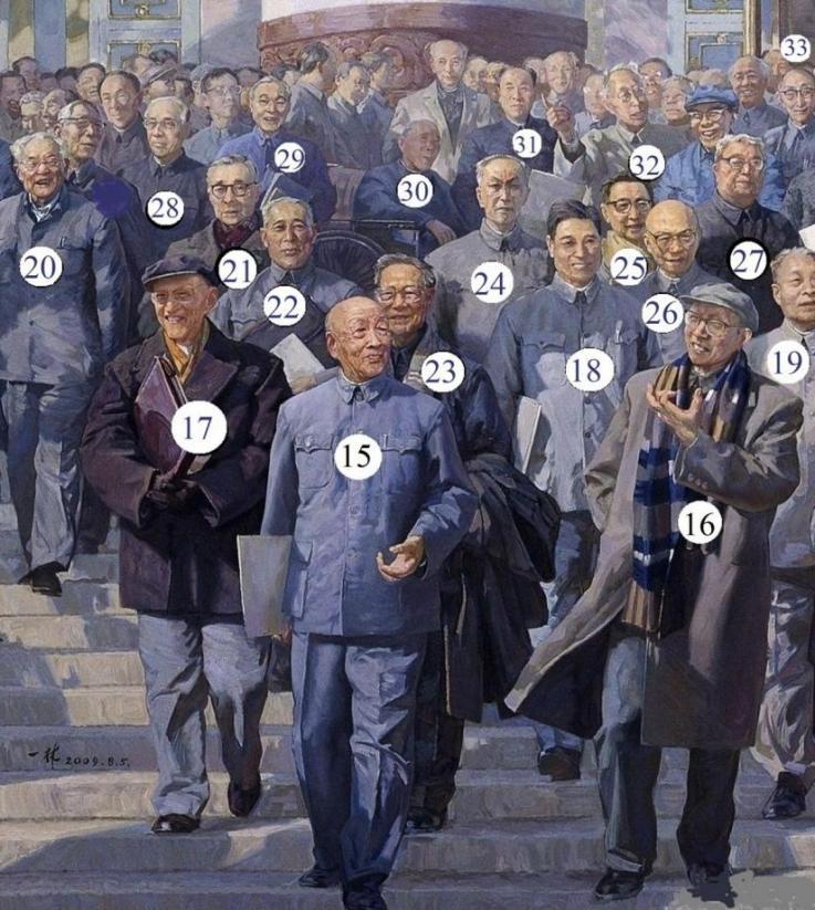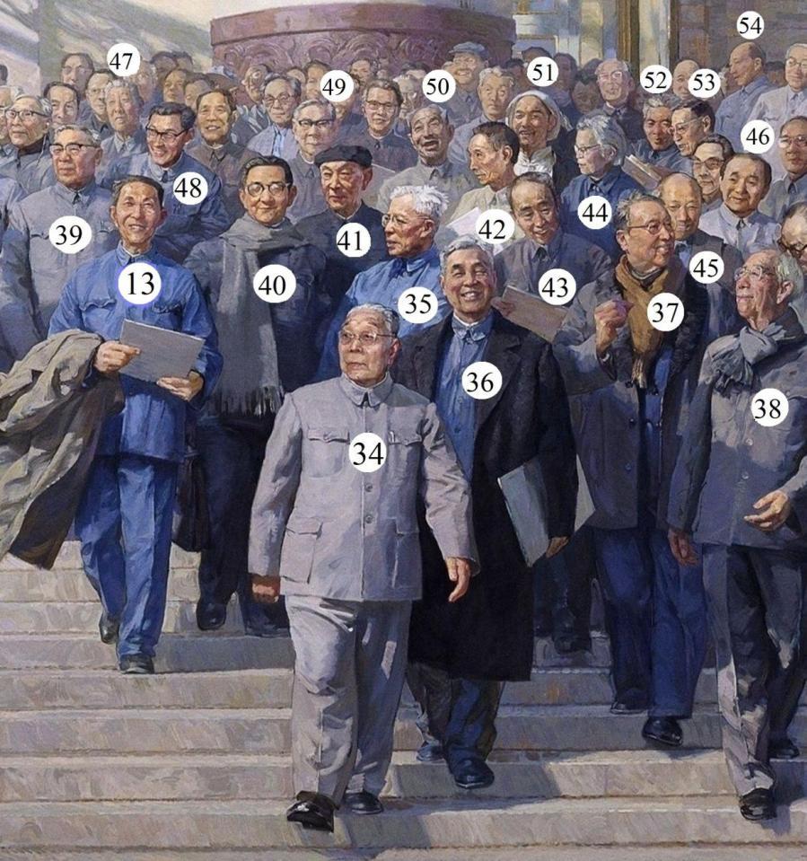 画家当然最清楚笔下那些形象的来源,猜想他还保存着某些素材甚至工作日志,只是见诸报章的文字语焉不详。他在一篇文章中提到:“人选来源于当年《人民日报》刊登的科学家名单,我从这个名单里选择了来自不同领域的科学家。在搜集人物形象资料时,我参考了当年的《人民画报》《解放军画报》《民族画报》等,画报上刊登的照片对我这幅画的创作非常重要”。以己度人,与其劳烦画家在繁忙的创作与教学之外答疑解惑,不如本人当一回福尔摩斯,探赜索隐,自娱自乐,标出自己能够确认的人物或疑似对象,顺便宣传一下他们的专业与功绩。判断的依据有三: