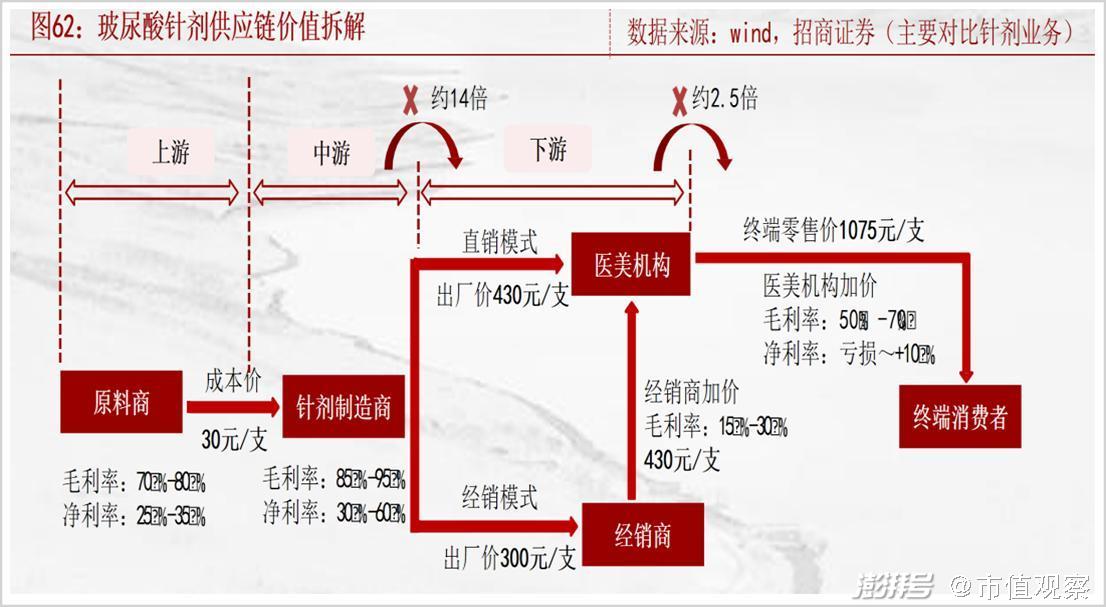 华熙生物所在的玻尿酸产业,从原料端开始科技含量就比较高,利润相对丰厚,吸引了大量的市场参与者进来,尤其是在门槛较低的下游服务领域。