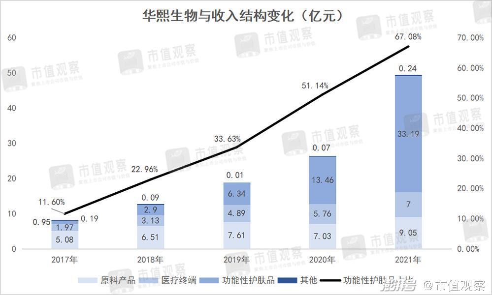 功能性护肤品的成功转型,短暂对冲了华熙生物在玻尿酸原料业务上的停滞不前与玻尿酸医美终端产品的布局落后的局面。
