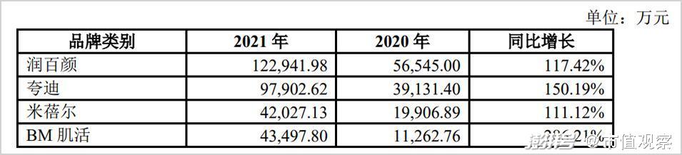 目前,华熙生物功能性护肤品四大子品牌矩阵业已成型。其中,2021年全年“润百颜”与“夸迪”两大子品牌收入近10亿元左右,“米蓓尔”与“BM肌活”两个子品牌收入超过4亿元。