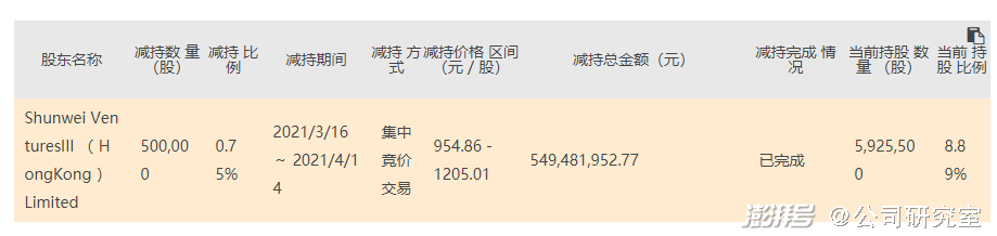 在首轮减持中,顺为资本仅用半个月时间就完成了减持计划,顺为资本总共减持50万股,总减持金额为5.49亿元。