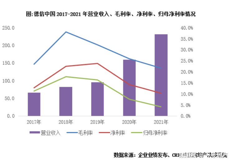 未经审计的财报显示,2021年德信中国实现收入231.09亿元,同比增45.6%,毛利润约为50.11亿元,同比增22%,整体毛利率21.8%,同比下滑4.2个百分点;