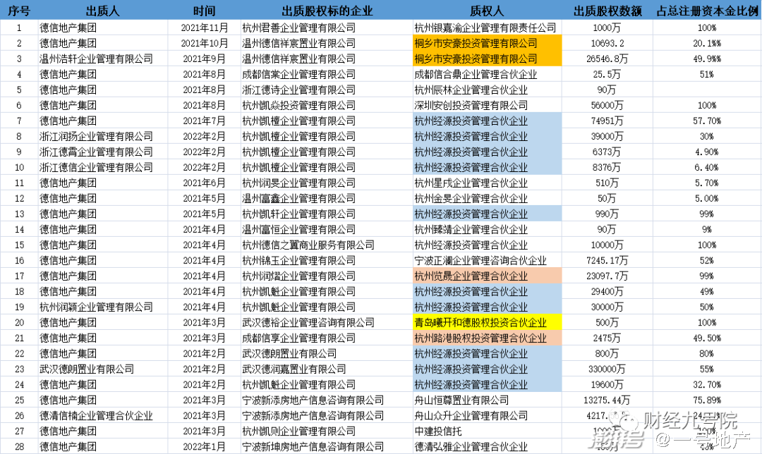 据媒体在天眼查的数据统计,2021年以来,德信旗下公司大量通过向各类合伙企业、投资公司以及信托进行股权质押融资,总数高达28笔。