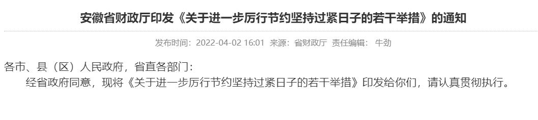 近日,安徽省财政厅印发《关于进一步厉行节约坚持过紧日子的若干举措》的通知,开出控制压减行政开支的十二条具体措施,提出在确保工作任务不减、工作质量不降前提下,坚决做到厉行勤俭节约、反对铺张浪费,真正将过紧日子要求落到实处。