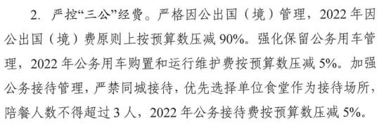 严控“三公”经费。严格因公出国(境)管理,2022年因公出国(境)费原则上按预算数压减90%。2022年公务用车购置和运行维护费按预算数压减5%。2022年公务接待费按预算数压减5%。