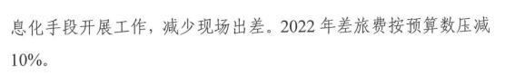 严控差旅费。鼓励创新工作方式,充分运用大数据、云计算等信息化手段开展工作,减少现场出差,2022年差旅费按预算数压减10%。
