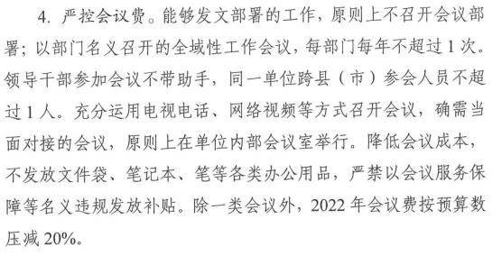 严控会议费。以部门名义召开的全域性工作会议,每部门每年不超过1次,充分运用电视电话、网络视频等方式召开会议,确需当面对接的会议,原则上在单位内部会议室举行,2022年会议费按预算数压减20%。