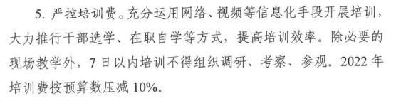 严控培训费。充分运用网络、视频等信息化手段开展培训,大力推行干部选学、在职自学等方式,提高培训效率。除必要的现场教学外,7日以内培训不得组织调研、考察、参观,2022年培训费按预算数压减10%。