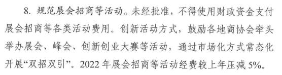 规范展会招商等活动。未经批准,不得使用财政资金支付展会招商等各类活动费用。创新活动方式,鼓励各地商协会牵头举办展会、峰会、创新创业大赛等活动,通过市场化方式常态化开展“双招双引”。2022年展会招商等活动经费较上年压减5%。