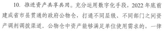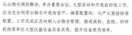 推进资产共享共用。充分运用数字化手段,2022年底前建成省市县贯通的政府公物仓,打通不同层级、不同部门之间资产调剂调拨渠道。公物仓中资产能够满足单位使用需求的,一律从公物仓调剂解决。举办重要会议、大型活动和开展临时性工作,应当充分利用公物仓中现有资产,确需配置的,从严从紧按标准配置,工作完成后及时纳入公物仓管理。推进高校、医院、科研机构等单位大型仪器设备共享共用,提升设备使用效率。