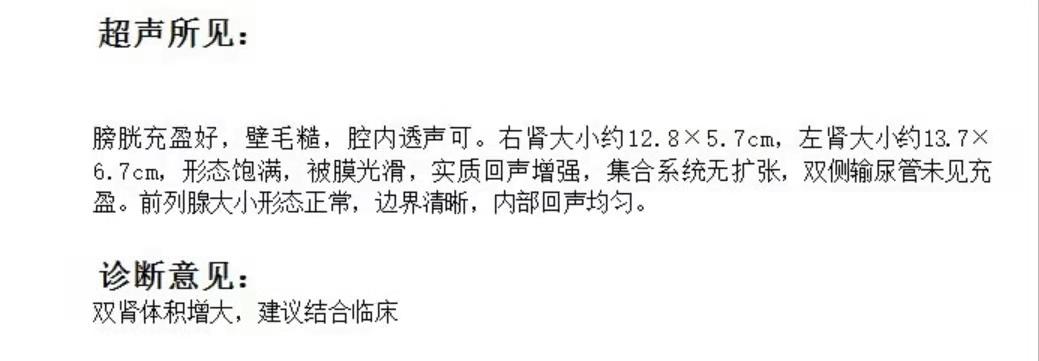 泌尿系彩超发现双肾体积增大;腹部彩超未见明显异常。
