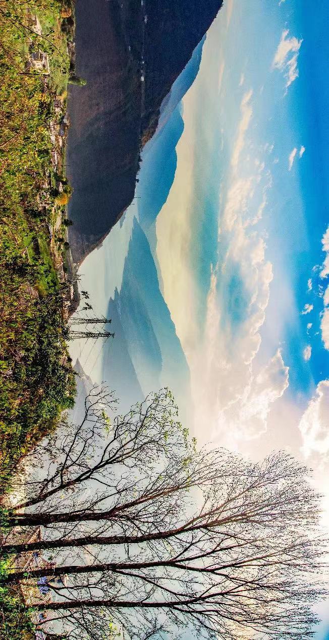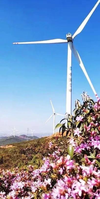 在漫山遍野的春色中,三峡风车耸立,风叶“闻风起舞”,风机“触风来电”。梯田与风车相映成辉,铁塔与电线胜似琴瑟。