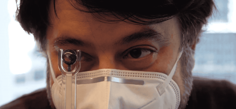 斯科特·斯坦恩只能通过手持一个特殊的小支架来给AR隐形眼镜供电,并将AR隐形眼镜贴近自己的眼球来感受显示效果。
