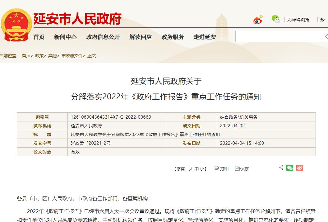 原标题:《延安市人民政府关于分解落实2022年《政府工作报告》重点工作任务的通知》