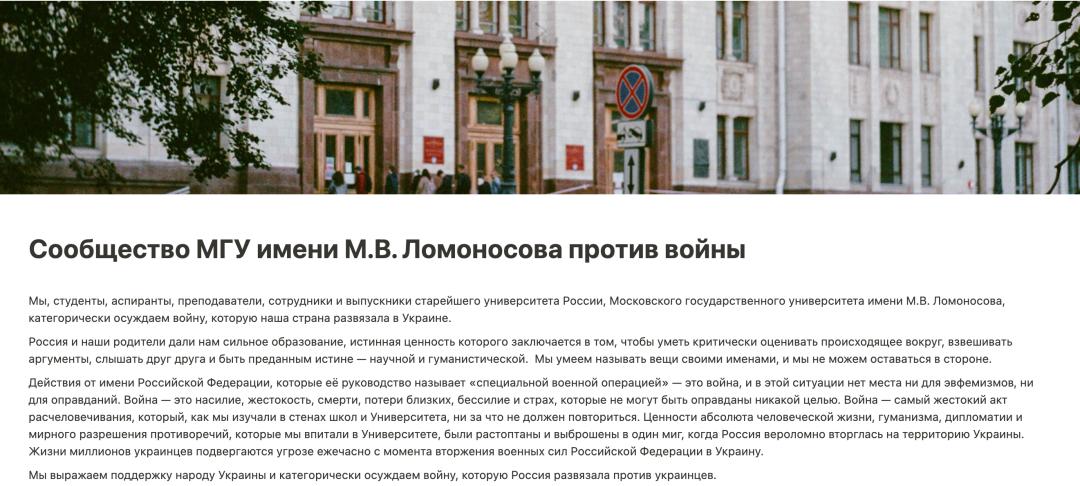 俄罗斯某大学发布的反战声明网页截图