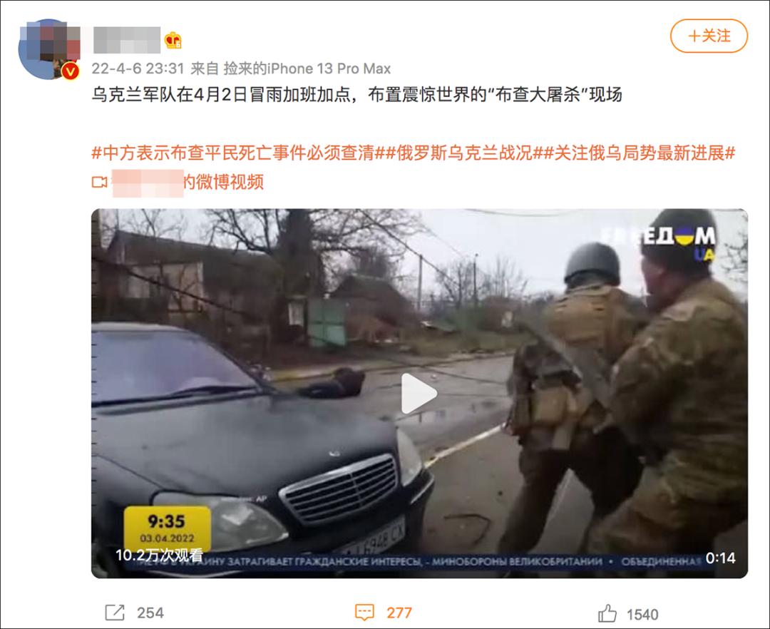 4月6日,有微博用户发布视频称“乌克兰军队在4月2日冒雨加班加点,布置震惊世界的‘布查大屠杀’现场”。视频画面显示,乌克兰军队在街道上拖拽尸体。